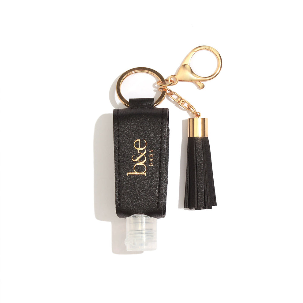 This holder comes with a chic tassel and a convenient gold clip keyring, allowing you to attach it to your keys, handbag, diaper change clutch, or baby bag with ease. What's more, it includes an eco-friendly, refillable 30ml sanitiser bottle dispenser, making it both fashionable and functional. This compact and fashionable accessory keeps your hand sanitiser accessible wherever you go.